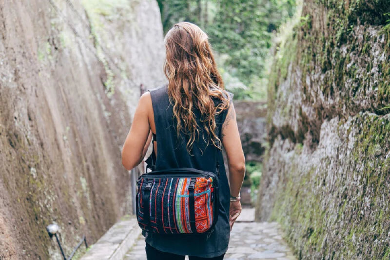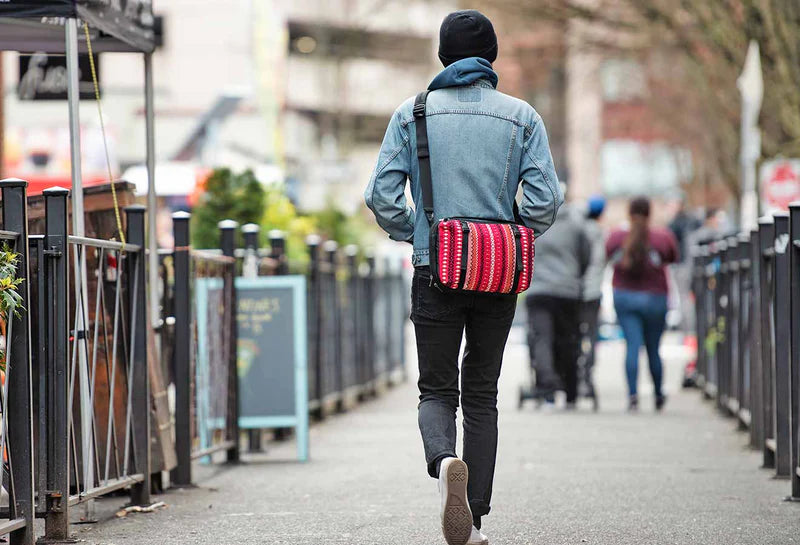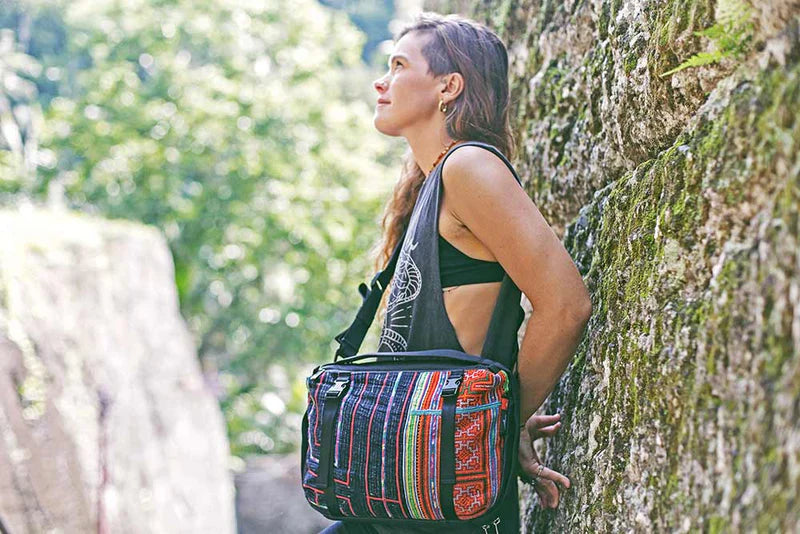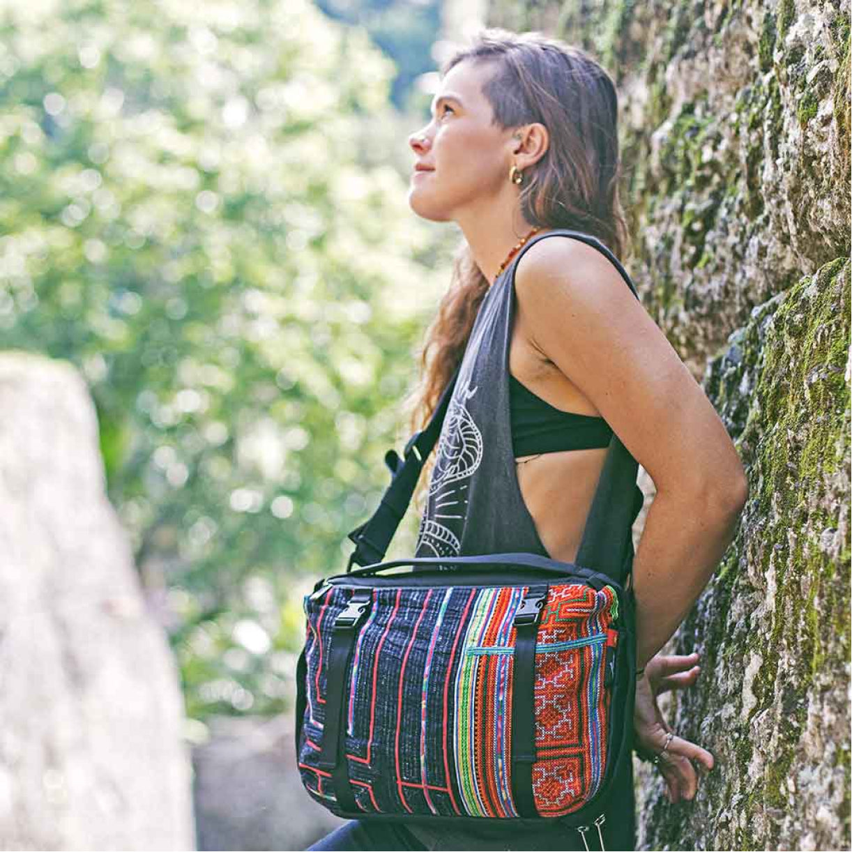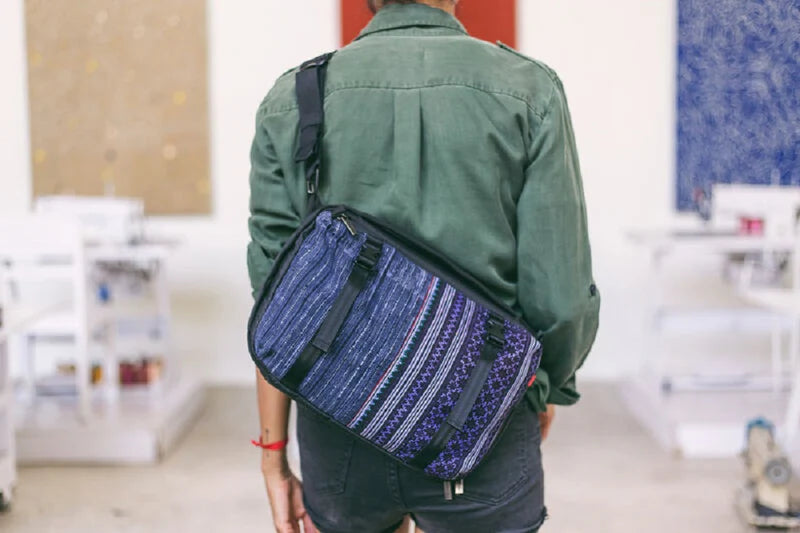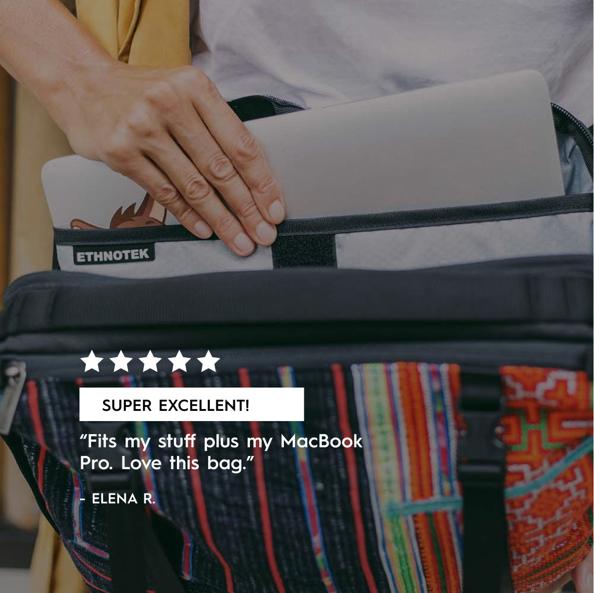 このバッグの仕上げとして、フロントパネルには職人の手作りの生地が使われており、外装は100%リサイクルされたプラスチックボトルから作られた耐水性のPET素材でできています。市場で最も環境に優しく、社会的責任を果たすミニラップトップバッグの1つです!