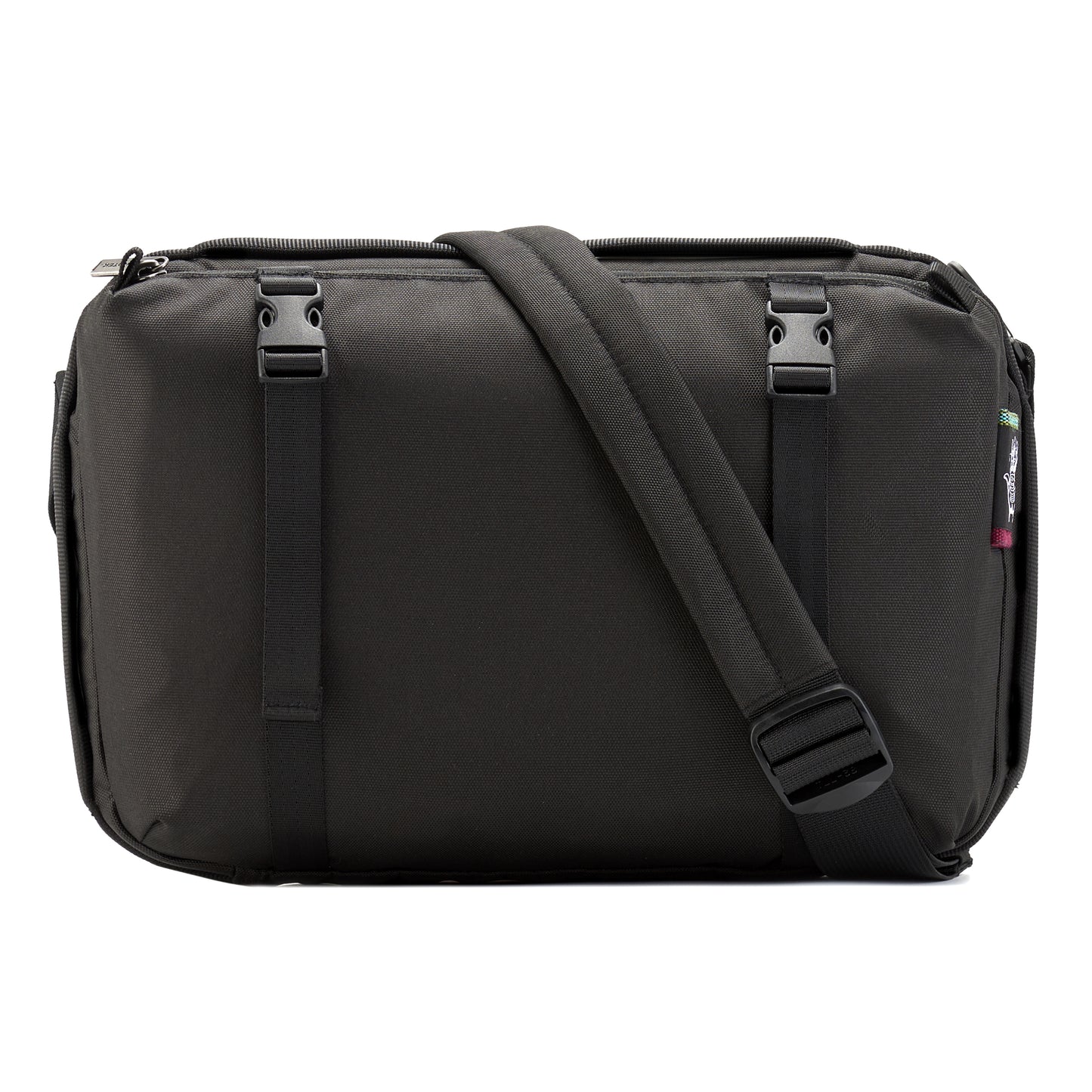 前面のジッパーポケットは、移動中にすぐに取り出したいアイテムを収納するのに最適です。また、前面のストラップを使って、ジャケットや小型のカメラ三脚など、バッグの中に入らないかさばるアイテムを取り付けることができます。調節可能でパッド入りのショルダーストラップは、左肩掛けでも右肩掛けでも使え、快適な装着感を提供します。